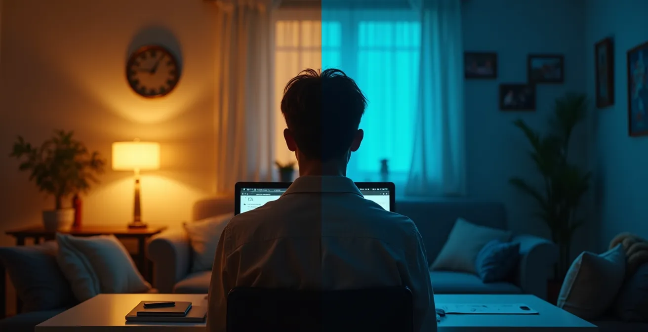 Die Freiheit, die Arbeitszeit flexibel zu gestalten, ist einer der grössten Vorteile des Homeoffice. Doch diese Freiheit hat eine gefährliche Kehrseite. Wenn der Laptop nur eine Armlänge entfernt ist, verschwimmen die Grenzen zwischen Anspannung und Entspannung. Das Resultat ist ein chronisch aktiviertes Nervensystem. Dein Körper bleibt im „Kampf-oder-Flucht“-Modus, auch wenn du längst auf dem Sofa sitzen solltest. Die Folgen sind oft die ersten, die du spürst: Einschlafprobleme, unruhiger Schlaf und eine unerklärliche Gereiztheit am nächsten Tag. Du bist nicht allein damit; laut einer Umfrage erleben rund 60% der Arbeitnehmer im Homeoffice genau dieses Verschwimmen der Grenzen.